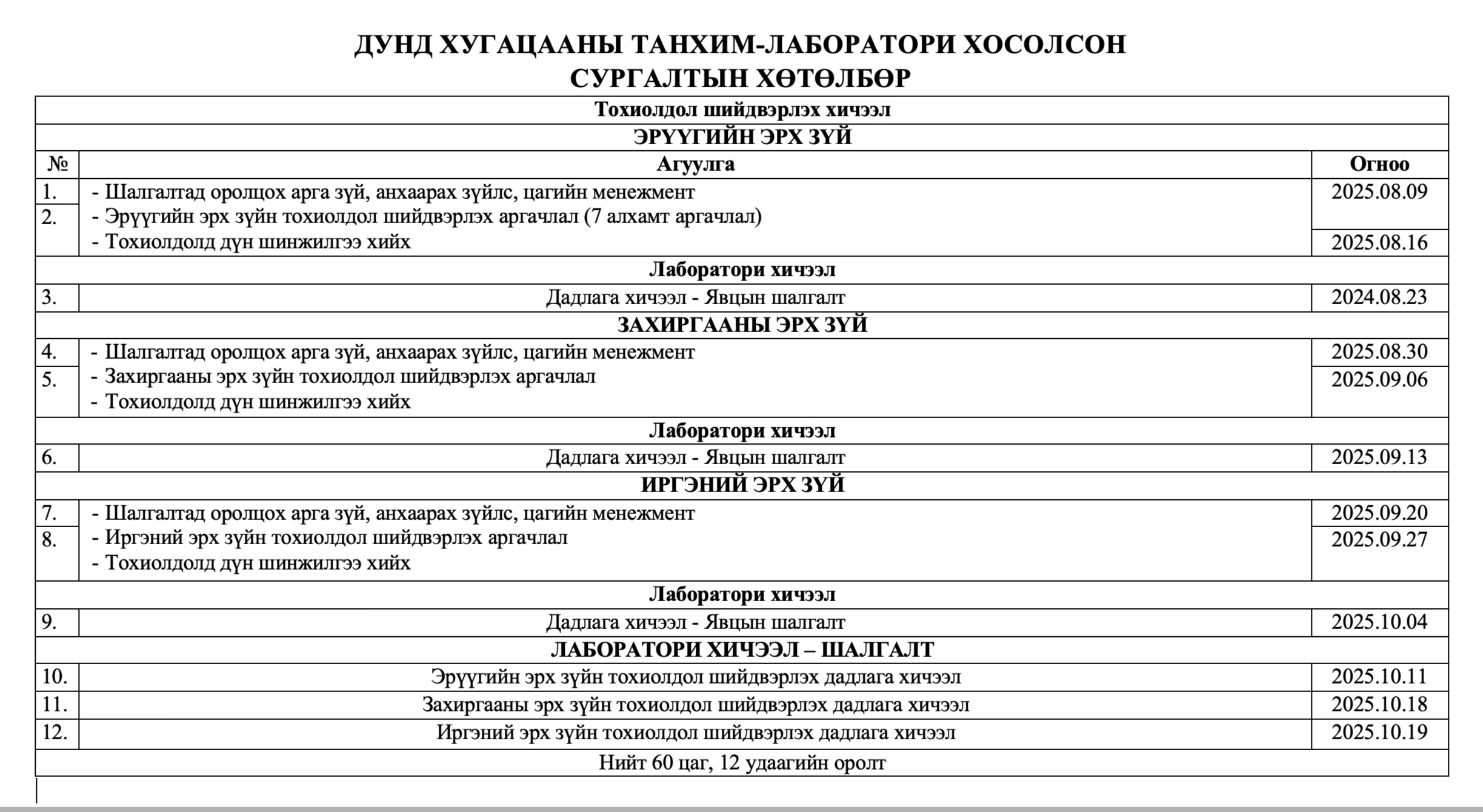 - 6 оролт /30 цаг/ лабораторид хичээллэнэ.